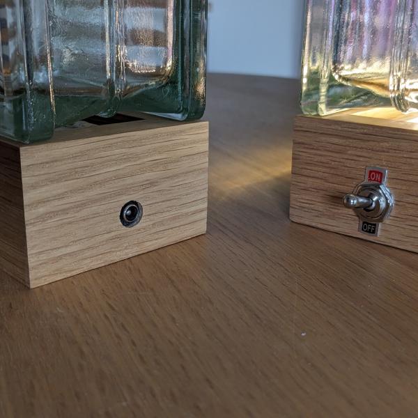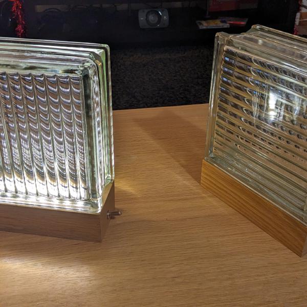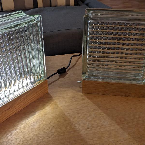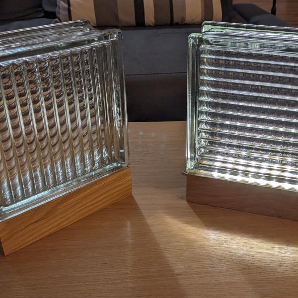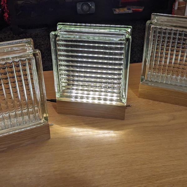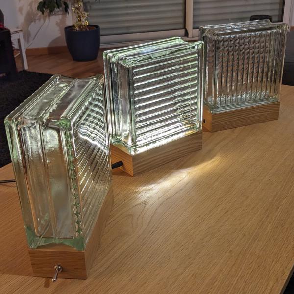 It started on December 15th, seeing this post on Reddit from Estragon94. Seeing this was a big relief for me, with Christmas approaching. It is a really nice lamp, quite simple to build in 9 days, and this idea is just great, reusing a glass block, an object I see as a bit dated, highlighted on a simple wooden base. I would have loved to reuse an existing block, but with the delay I had, and the fact that I wanted to build 3 lamps, the easiest was to buy new ones. Something I was ignoring before building this is that the glass blocks are painted white on all four sides. So I grabbed an old knife and scratched off this white paint. The rest of the build is straightforward. I used 5V LEDs I had, put an on/off switch on one side, a power plug on the other.